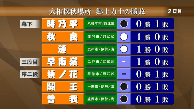 大相撲秋場所2日目、郷土出身力士の取り組みの結果です。