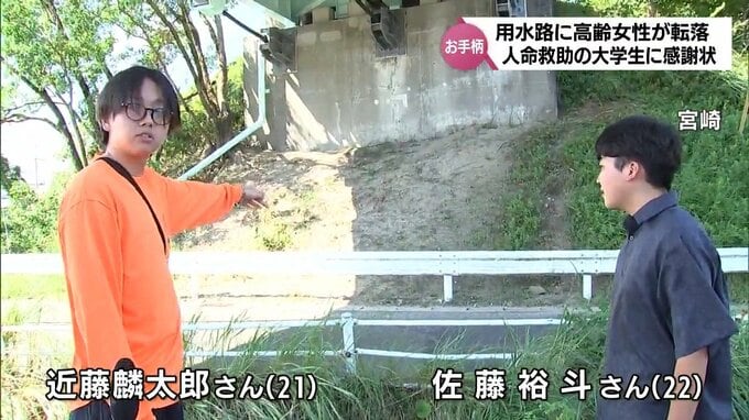 大学生による人命救助のニュースです。用水路に落ちた高齢の女性を救助した宮崎市の大学生2人に警察から感謝状が贈られました。宮崎大学工学部4年の近藤麟太郎さんと佐藤裕斗さん。今年7月、2人が宮崎市内を車で走…