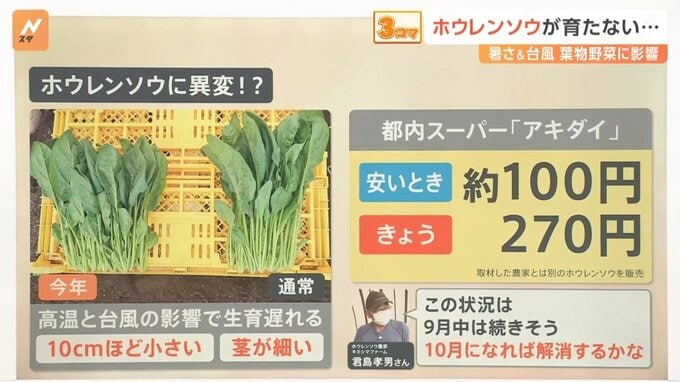 ホウレンソウは1把100円→270円に “高騰の流れ”は9月中は続く?