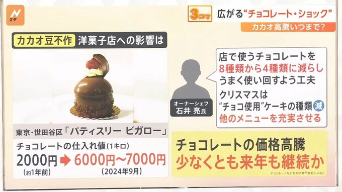 東京・世田谷区の「パティスリー ビガロー」によると、チョコレートの仕入れ価格(1キロ)は、約1年前の2000円から、2024年9月には6000円~7000円と3倍以上になっています。