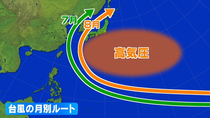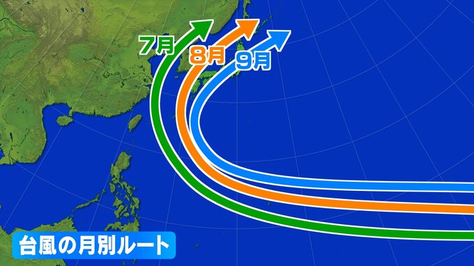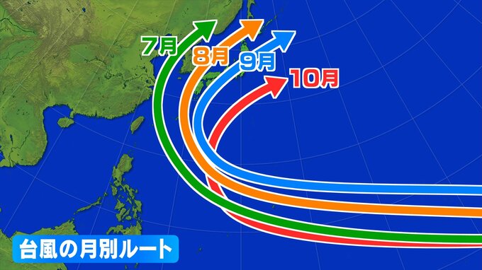 台風の月別ルートを見てみると、夏は、太平洋高気圧の周りを回って、北上する台風が多くなりますが、9月頃から高気圧の勢力が弱まり、日本付近に近づくルートを通るようになります。