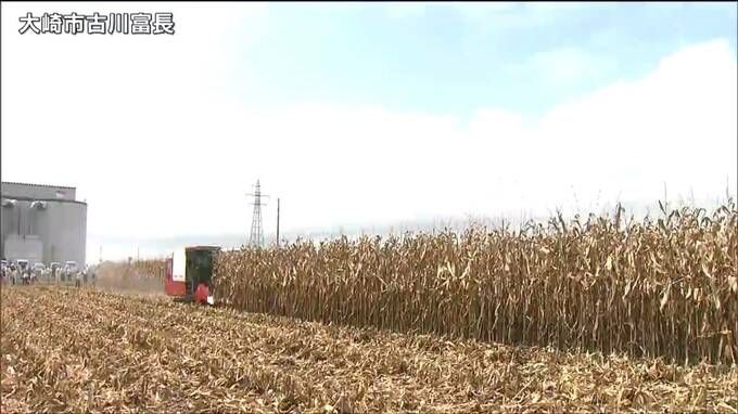 家畜のえさの原料となる飼料用トウモロコシの生産拡大に向けて、宮城県大崎市で10日、収穫作業の実演が行われました。