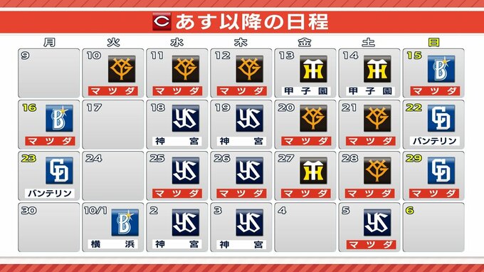 広島カープは、10日からヤマ場を迎えます。残り22試合、10月5日まで戦います。10・11・12日はジャイアンツと、13・14日は阪神と、そして15・16日はDeNAと優勝争いの上位と対決です。
