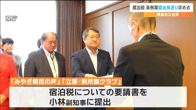 宮城県が導入を目指す宿泊税について、県議会の立憲民主党系2会派が県に要請書を提出し、9月議会での条例案の提出を見送るよう求めました。