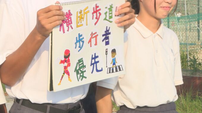 夢が丘中学校の生徒6人が、スケッチブックに手書きのメッセージで、横断歩道での歩行者優先を呼びかけます。