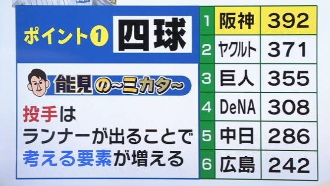 ―――9月3日~8日の6試合は5勝1敗の阪神。9月2日時点では首位と5.5ゲーム差ありましたが、9月9日時点で2.5ゲーム差に縮まりました。岡田監督はシーズンが始まる前から9月が勝負ということを話しています。そうした中で、能見さんに3つのポイントを挙げてもらいました。1つ目は「フォアボール」。今季、阪神が選んだフォアボールの数は現在、リーグで一番多いですね。