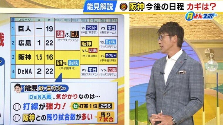 「DeNA自体も『チャンスあるな』っていうのは感じているはずなので、阪神戦にいいピッチャーを必ず持ってきます。阪神としては甲子園というところが結構アドバンテージになるはずなので、まずDeNA3連戦(10日~12日)を何とか勝ち越さないと、ちょっと上を見てる場合ではなくなります」