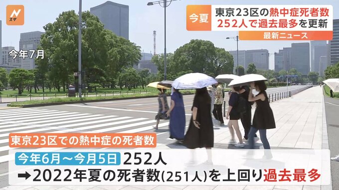 東京23区で確認された今年の夏の熱中症の死者数が252人に上り、2022年の夏を上回って過去最多を更新しました。東京都監察医務院によりますと、東京23区で今年6月から今月5日までに確認された熱中症の死者数は252人…