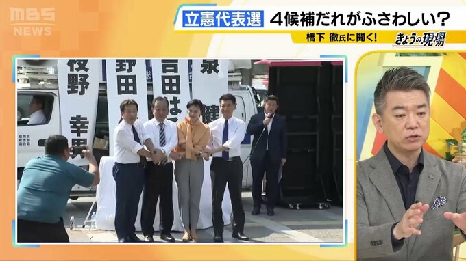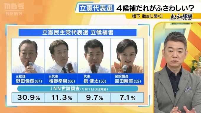 野党第一党、立憲民主党も代表選が行われます。当初は野田佳彦氏(67歳)、枝野幸男氏(60歳)、泉健太氏(50歳)の3人が立候補を表明して、最後に吉田晴美氏(52歳)が駆け込みで加わりました。JNNの世論調査によると、支持率のトップは野田佳彦氏で30.9%。続いて枝野幸男氏が11.3%、泉健太氏が9.7%、吉田晴美氏が7.1%となっています。