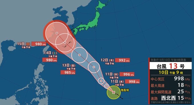 気象庁によりますと10日午後9時、マリアナ諸島の熱帯低気圧が台風13号になりました。