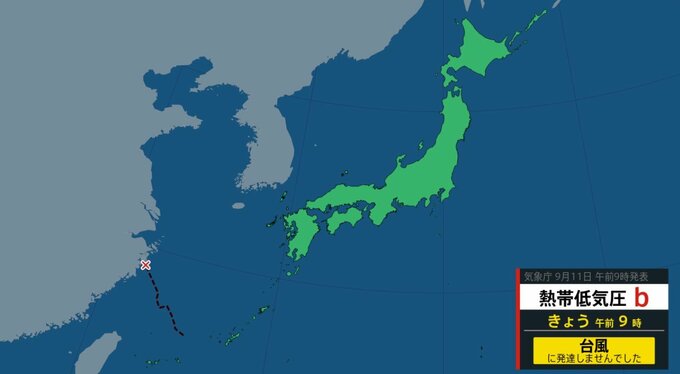 【台風情報 11日午前11時更新】台風13号(バビンカ)は14日頃に沖縄接近か 東シナ海の熱帯低気圧は台風にならず【雨風シミュレーション】晴れても天気の急変のおそれ…九州~関東は35℃以上の猛暑日も チューリップテレビ 2024年9月11日(水) 11:32 国内 東シナ海の熱帯低気圧は台風にならず 東シナ海の熱帯低気圧は11日午前6時、時速15kmの速さで北西へ進んでいます。当初は12時間以内に台風へ発達する見込みでしたが、午前9時までに予想が変わり台風にまで発達しないことがわかりました。