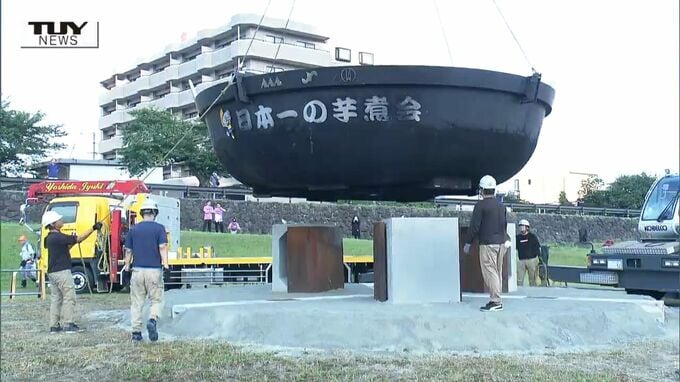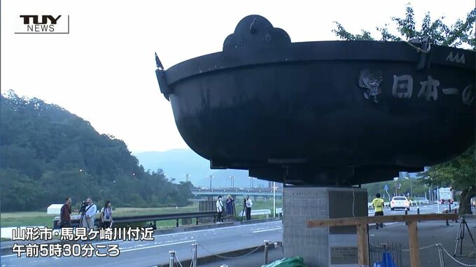 今月15日に開催される「日本一(にほんいち)の芋煮会フェスティバル」に向け、けさ、フェスティバルで使われる直径6.5メートルの大鍋「三代目鍋太郎」が会場の山形市の馬見ヶ崎川河川敷に移されました。