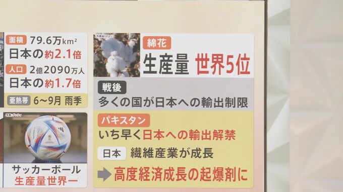 パキスタンの産業で有名なのは綿花です。生産量は世界の5位。戦後、多くの国が日本へ輸出を制限した時期がありました。このときにパキスタンはいち早く日本への輸出を解禁しました。特に輸出が多かったのが綿花です。それによって日本は繊維産業が成長するようになり、高度経済成長の起爆剤にもなりました。実はここにパキスタンが関わっていたのです。