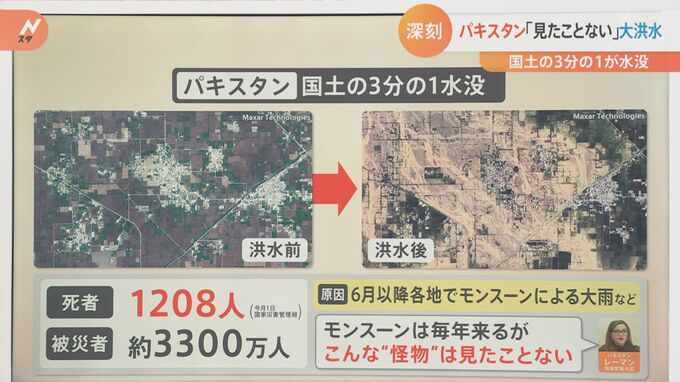 9月1日、国家災害管理局によると現在、亡くなった方は1208人。被災している人は約3300万人に上っています。この洪水の原因は、6月以降各地で起こっているモンスーンによる大雨などです。