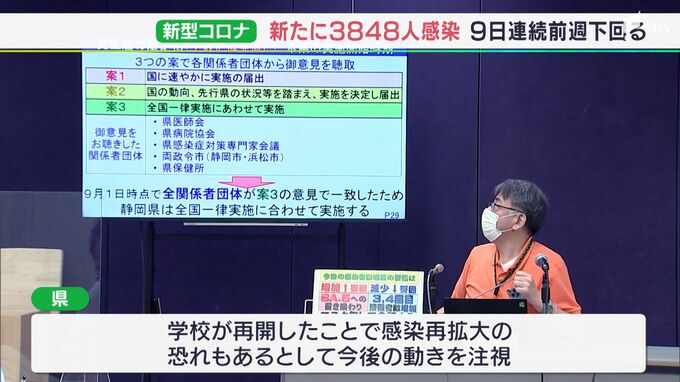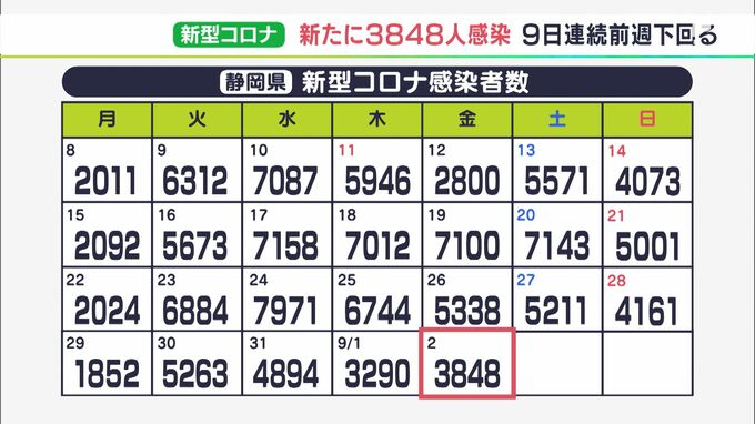 静岡県内では9月2日、新たに3848人が新型コロナウイルスに感染したことが分かりました。9日連続で前の週の同じ曜日を下回っていて、病床使用率も低くなっています。