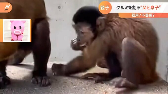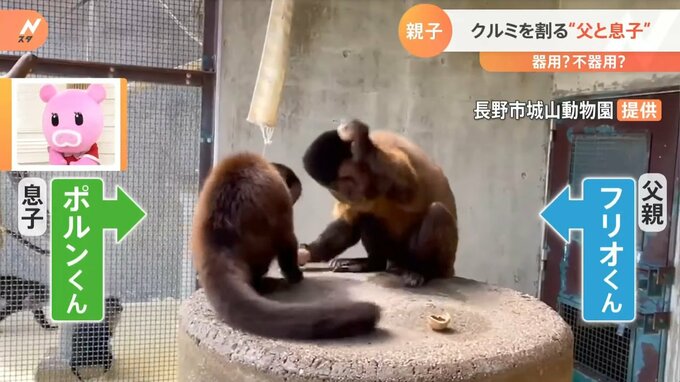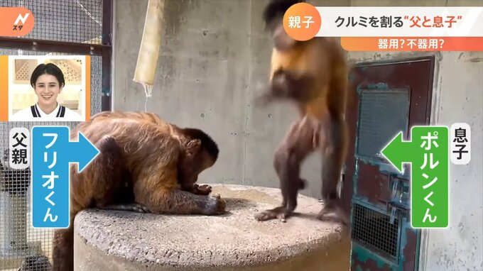 この日は、久しぶりにクルミをもらった親子。まず、父親のフリオくんが、割り方を教えます。