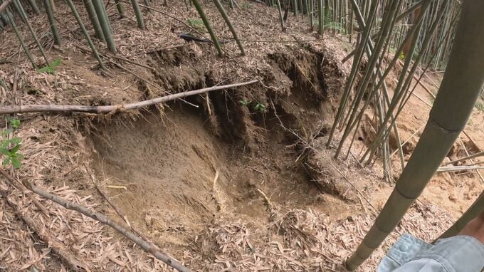 「これがまさに(土砂崩れの)一番上。大雨が降ると、ここの中に水が染み込んで全体的に湿っていく。水が流れやすい所があると、そこに(水が)集中するので、ある時ずるっと滑る」