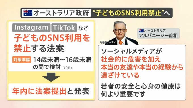 オーストラリアのアルバニージー首相は、「ソーシャルメディアが社会的に危害を加え、本当の友達や本当の経験から遠ざけている。若者の安全と心身の健康は何より重要です」と話しています。