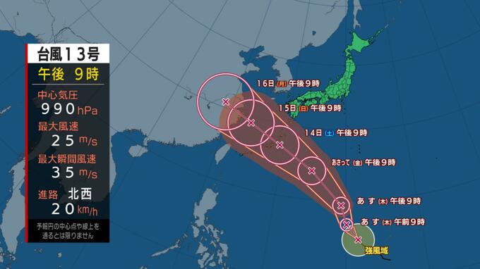 台風13号は11日21にはマリアナ諸島にあって1時間におよそ20キロの速さで北西へ進んでいます。中心の気圧は990ヘクトパスカル、中心付近の最大風速は25メートル、最大瞬間風速は35メートルとなっています。