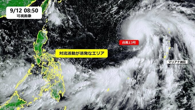 12日朝現在、台風13号はマリアナ諸島付近にあって、1時間におよそ25キロの速さで北北西へ進んでいます。
