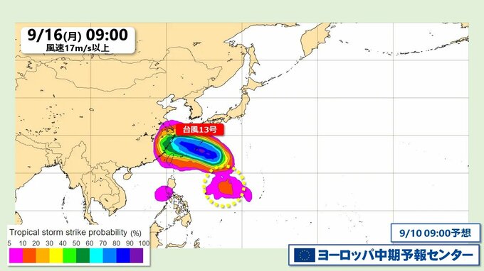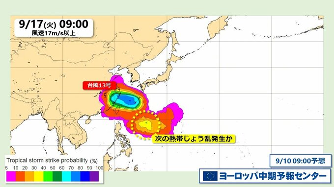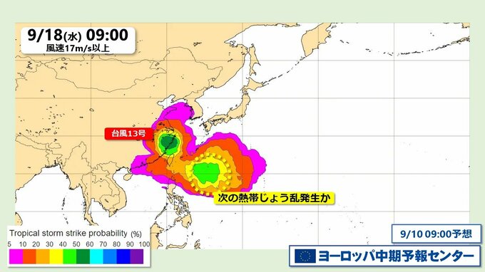 台風13号が沖縄方面を通過したあとに、日本の南の海上で確率が高くなっているエリアが現れています。これは13号とは別の熱帯じょう乱が発生する可能性を示しています。