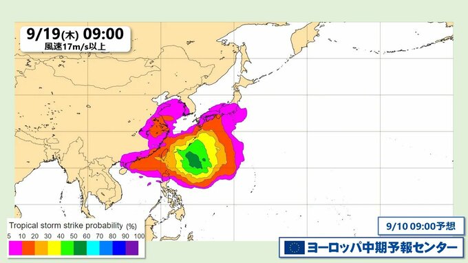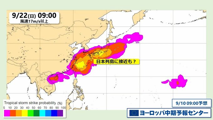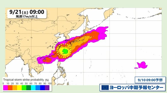 ヨーロッパ中期予報センターでは、ある予想時刻の48時間以内に、その場所から300キロ以内に熱帯低気圧が通過する可能性を確率で公表しています。