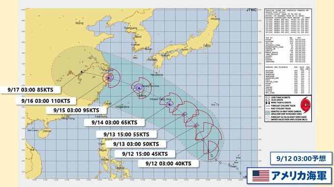 アメリカ海軍も台風13号について進路予想を発表しています。気象庁と同じようなコースで沖縄方面へと進む予想となってます。最大風速をみると南西諸島付近から東シナ海の海域で最も大きくなっていて発達のピークとなっています。