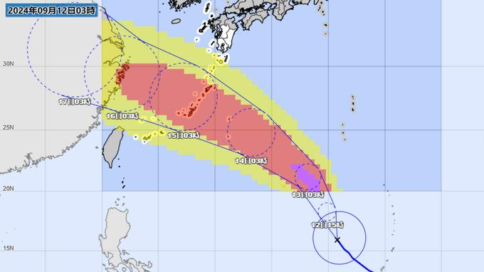 台風13号は発達しながら日本の南を北西へ進み、14日(土)~15日(日)頃にかけて、暴風域を伴い強い勢力で南西諸島に接近するおそれがあります。南西諸島では一部の電柱が倒壊したり、建物の一部が広範囲に飛散したりするおそれがあります。(12日午前5時26分 気象庁発表)