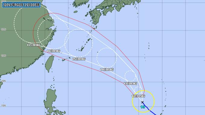 台風13号は12日午前3時現在、マリアナ諸島にあって1時間に20キロの速さで北西へ進んでいます。中心気圧は990ヘクトパスカル、中心付近の最大風速は25メートルです。予想進路はこれまでとほぼ変わっておらず、三連休に沖縄に接近する見込みとなっています。