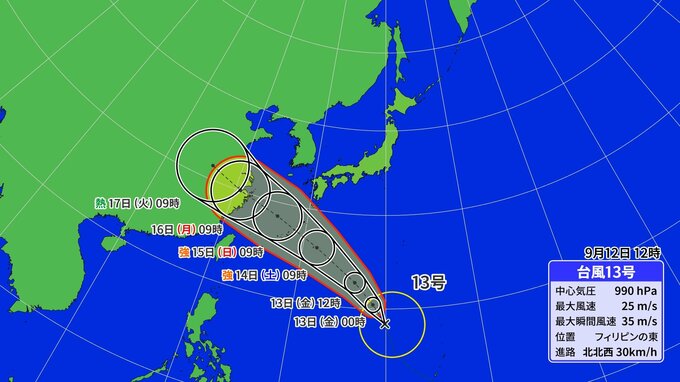 12日午後3時時点ではフィリピンの東付近にあり、現時点では3連休の14日(土)~15日(日)頃に沖縄地方へ接近・直撃する予想です。
