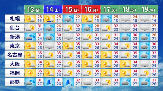 13日(金)の最高気温は、東京・名古屋・福岡で35℃が予想されています。