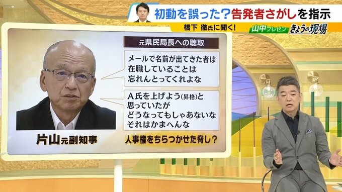 橋下氏は、兵庫県の片山安孝元副知事の対応にも問題があると述べました。元副知事は聴取時に「メールで名前が出てきた者は、在職していることは忘れんとってくれよな」「A氏をあげよう(昇格)と思っていたがどうなってもしゃないな」などの発言があったことなどが百条委などでわかりました。