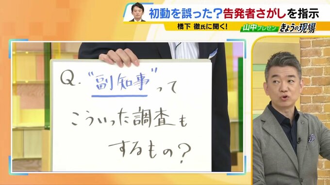 橋下氏は、「居酒屋で聞いた噂話」は元県民局長が否定している、としたうえで、「疑惑の当事者たちがうごめいた。第三者調査していないから、何がなんだかわからない。副知事が自分の疑惑を消すために一生懸命動いたという感じがしてならない、普通、副知事は調査に乗り出さないです。」としました。