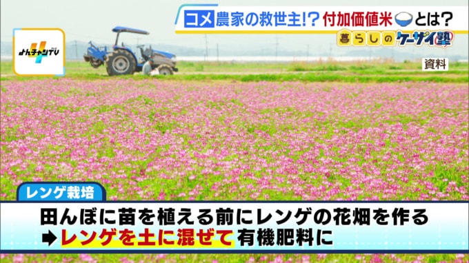 (西川信一さん)「この『夢つくし』は福岡のお米ですが、“レンゲ栽培”という方法で栽培したものです」レンゲ栽培とは、田んぼに苗を植える前にレンゲの花畑を作り、その後、レンゲの花を土に混ぜ込んで有機肥料にして育てる“安全・安心”をうたった自然農法です。普通のお米との価格差は…