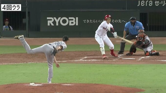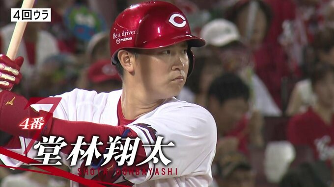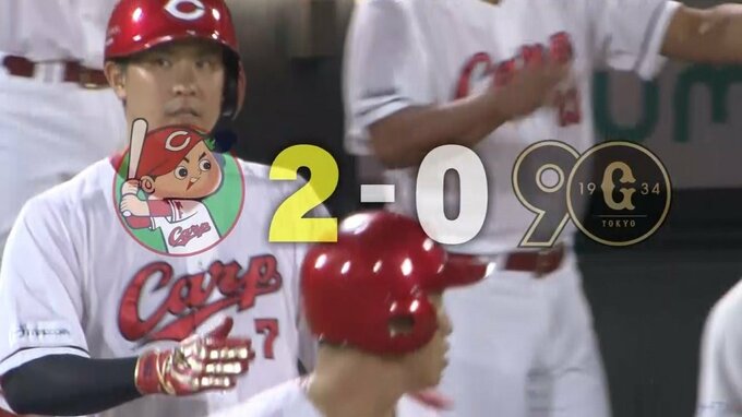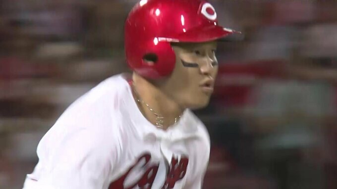 巨人先発・グリフィンに打率5割という4番起用・堂林翔太 。振り抜いた打球は、サード・坂本勇人 を強襲。グラブをはじき、ボールがそれている間に小園が一気にホームイン。カープが先制します。