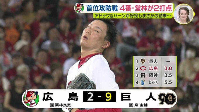 9回だけで9失点のカープ。まさかの2連敗で巨人とのゲーム差は3に広がりました。(広島 2-9 巨人)