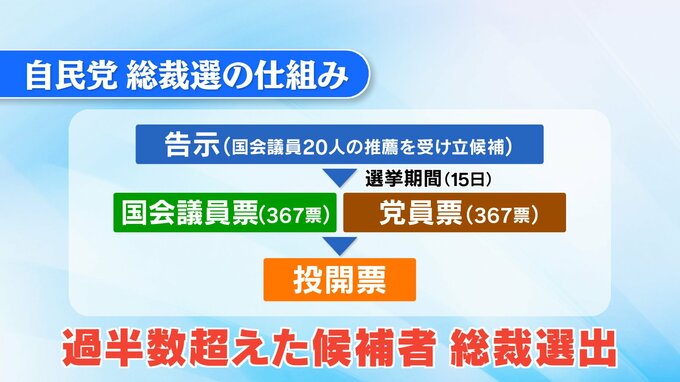 自民党の総裁選挙は、国会議員1人1票の「国会議員票」と、全国の党員・党友による投票で配分が決まる「党員票」で争われます。この「国会議員票」と「党員票」の合計で、過半数を超えた候補者が新たな総理として選出されます。
