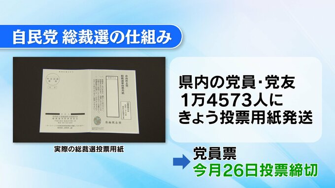 自民党県連では、県内の党員や党友、1万4573人に対し、12日に投票用紙を発送しました。「党員票」の投票は、9月26日に締め切られ、各都道府県連が集計した投票数を党本部でまとめ、候補者に配分されます。