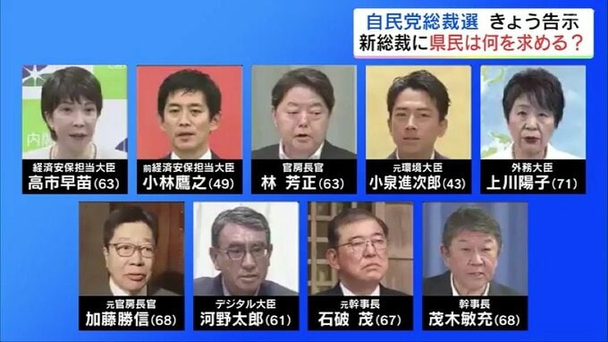自民党の総裁選挙に立候補したのは、高市早苗経済安保担当大臣、小林鷹之前経済安保担当大臣、林芳正官房長官、小泉進次郎元環境大臣、上川陽子外務大臣、加藤勝信元官房長官、河野太郎デジタル大臣、石破茂元幹事長、茂木敏充幹事長の9人です。