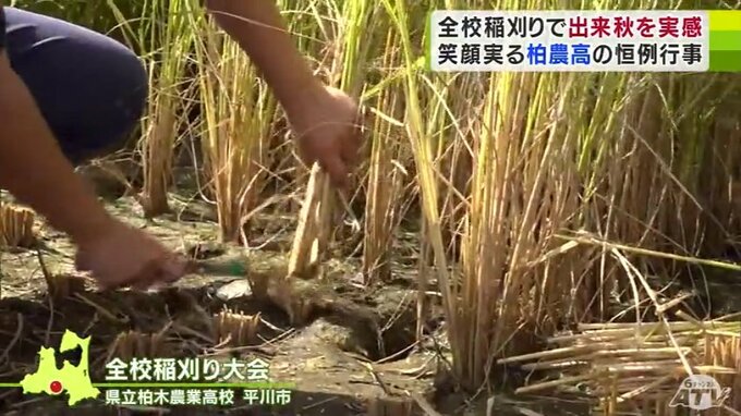 きびしい残暑の中、青森県平川市の農業高校で全校稲刈り大会が開かれ、生徒たちが実りの秋の恒例行事を楽しみました。出来秋の黄金の穂が垂れた田んぼ。県立柏木農業高校の生徒たちが5月に手植えした「まっしぐら…