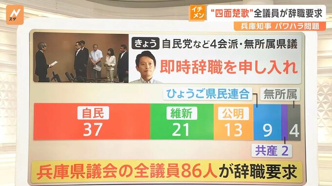 12日は、自民党など4会派と無所属の県議が即時辞職を申し入れました。これで兵庫県議会の全議員86人が辞職要求をしたという状況になっています。