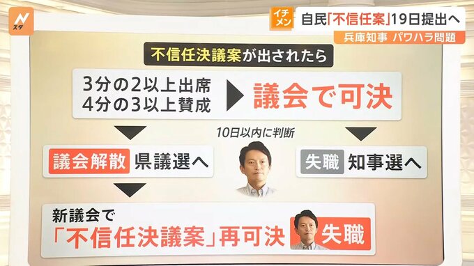 不信任決議案の提出が今月19日に決まりました。議員の3分の2以上が出席し、出席した議員の4分の3以上の賛成で、議会で可決ということになります。可決となると、斎藤知事は10日以内に議会の解散か、失職かの判断を迫られます。議会解散なら県議選、失職なら知事選になります。県議選になった場合、新議会で「不信任決議案」が再可決されると、斎藤知事は失職という流れです。