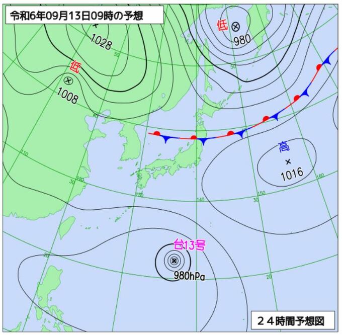 「台風13号 バビンカ」当初の予想より発達し、最大瞬間風速「55メートル」960hPa「強い」勢力となる見込み…3連休に沖縄直撃か 南西諸島では「猛烈な風」「猛烈なしけ」に 山陰放送 2024年9月13日(金) 01:09 国内 気象庁HPより 気象庁HPより