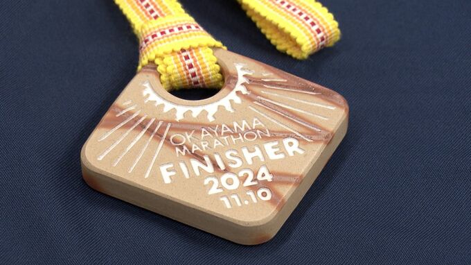 11月10日に開催される「おかやまマラソン2024」で、フルマラソン完走者に贈られる備前焼メダルです。太陽と降り注ぐ光で「晴れの国おかやま」をイメージさせるデザインです。