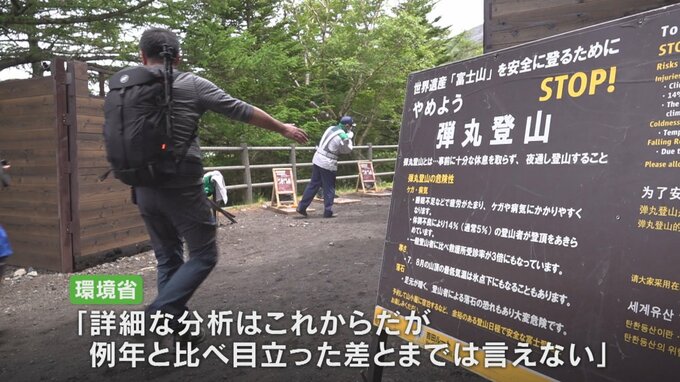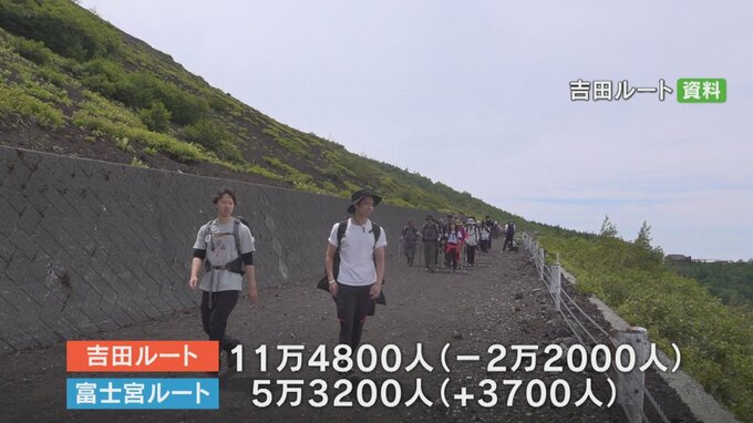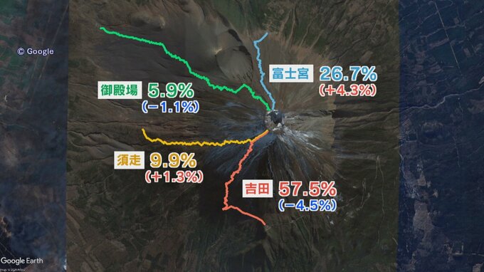 今年から山梨県側だけ通行料2000円の徴収など規制が行われたため、静岡県側に登山者が流れる懸念があった中、ルート別の割合を去年と比較すると吉田ルートは4.5ポイント減少しました。