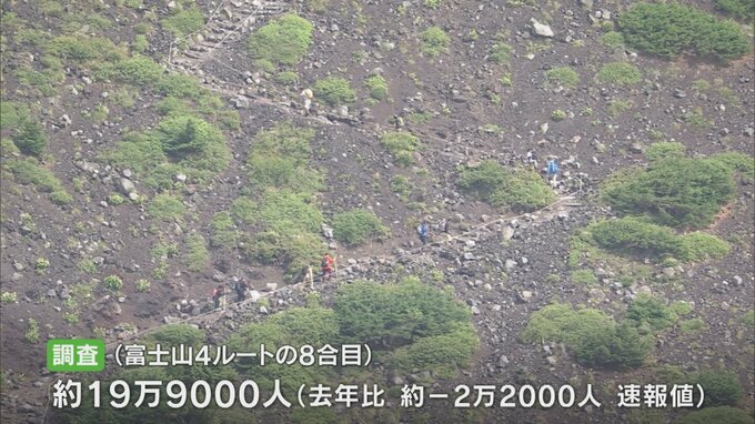 調査は環境省が富士山の4つの登山道の8合目で赤外線センサーを使って行い、13日更新された速報値で7月1日から今月10日までの登山者数は、およそ19万9000人で、去年より2万2000人ほど減少しました。
