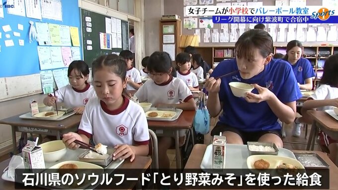 バレーボール教室の後には、石川県のソウルフード「とり野菜みそ」を使った給食が提供され、選手が子どもたちと一緒に食べて交流を深めていました。