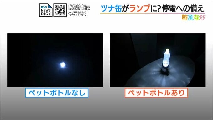 普通の懐中電灯では広い範囲を照らすことができませんが、ペットボトルを乗せるだけで、光が拡散されて明るく照らすことができます。