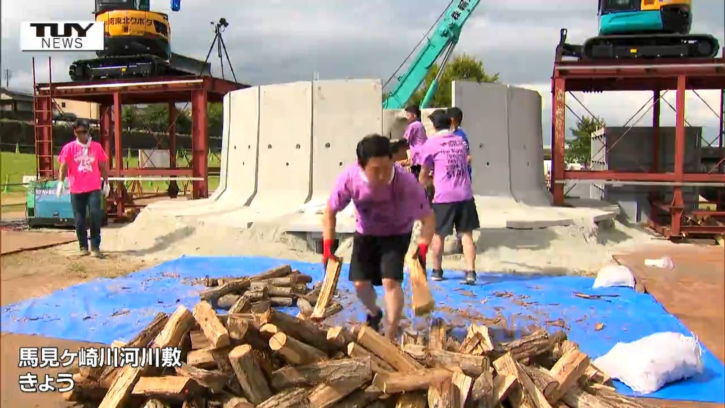 きょう馬見ヶ崎川の河川敷では、フェスティバルに使われる大鍋「三代目鍋太郎」用の薪を並べる作業が行われました。