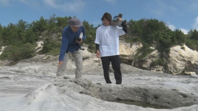「なにか異質なものがあるとその周りの部分が少し硬くなるってことは地層の中でよくあって、周りだけがちょっと硬くて、削られにくくて残ってることがあるのかもしれない。真ん中の部分は浸食されやすくて穴ができやすい、うまくそこに岩が入るときれいなポットホールができるのかもしれないですね」